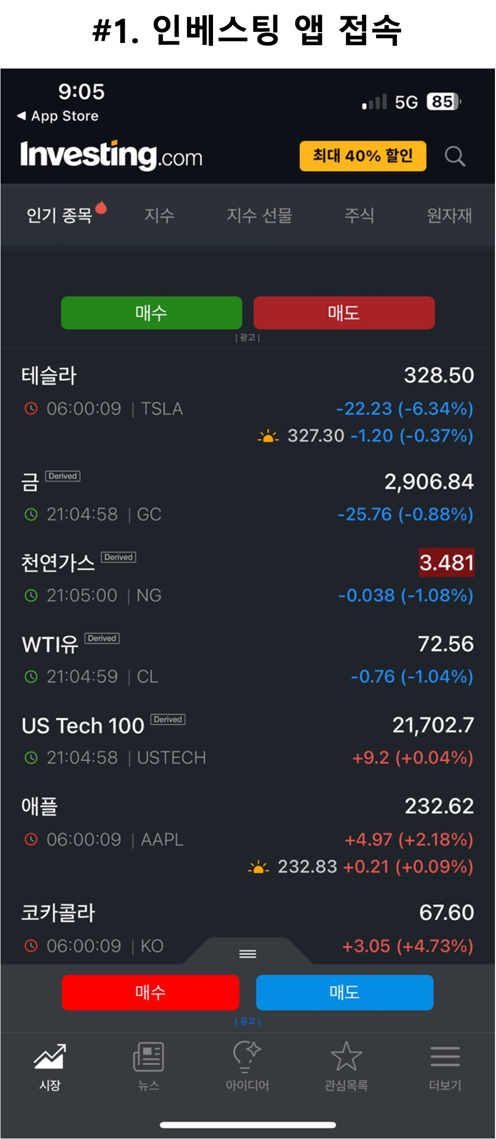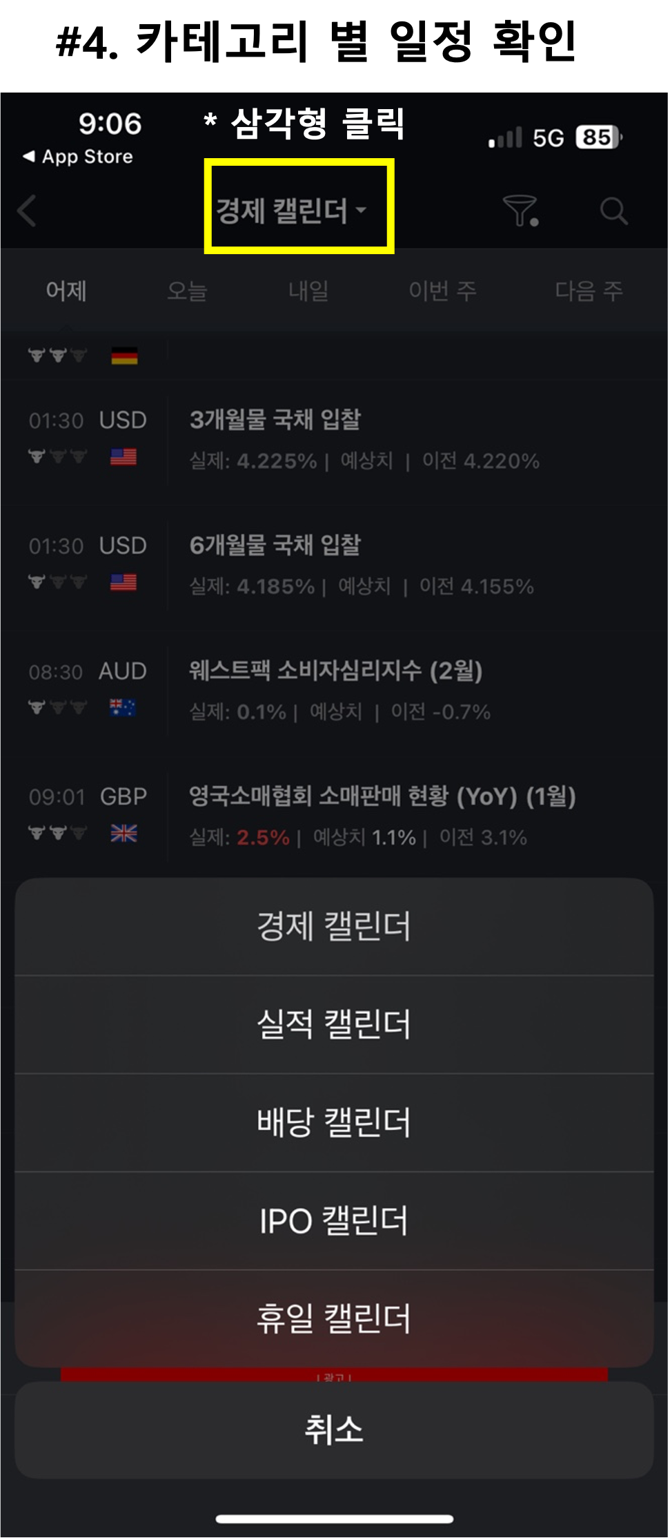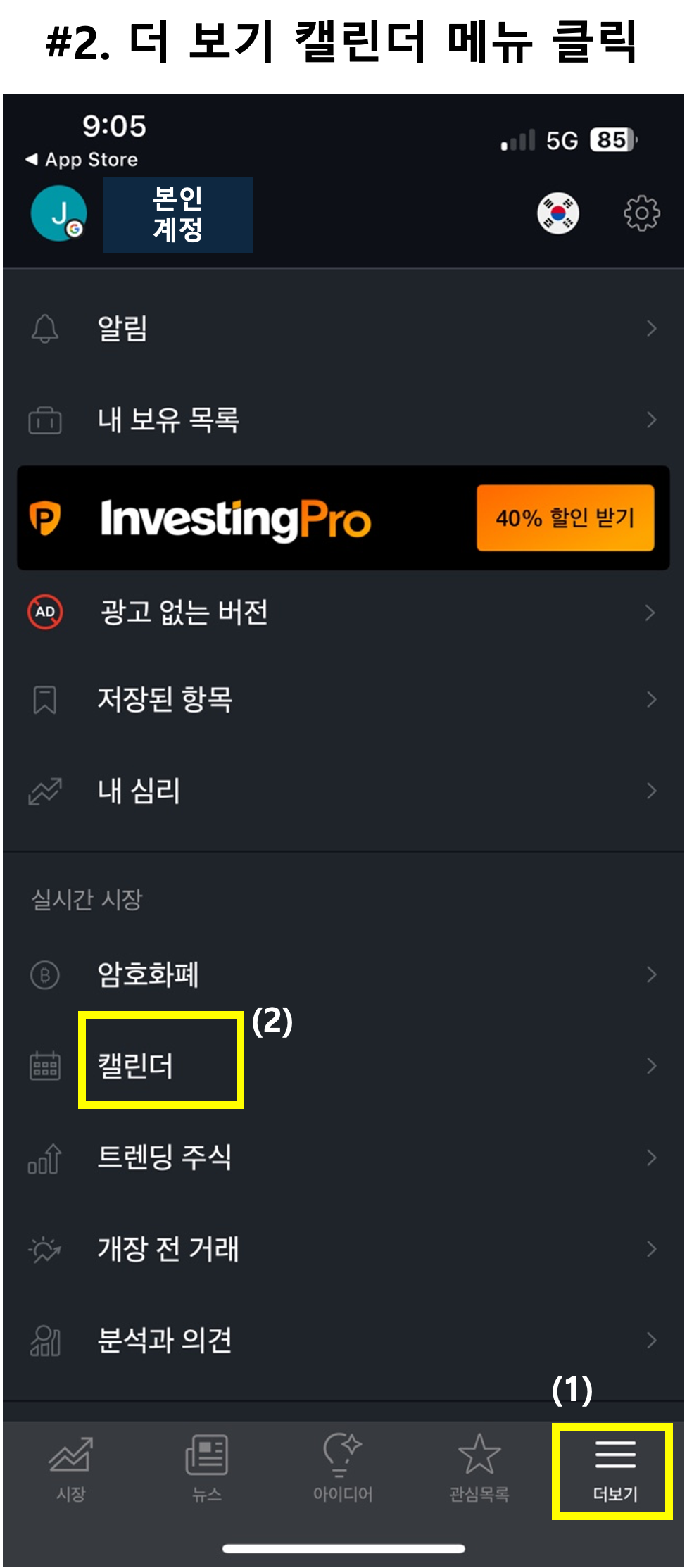 인베스팅 앱의 더보기 누른 후 캘린더 메뉴 진입
