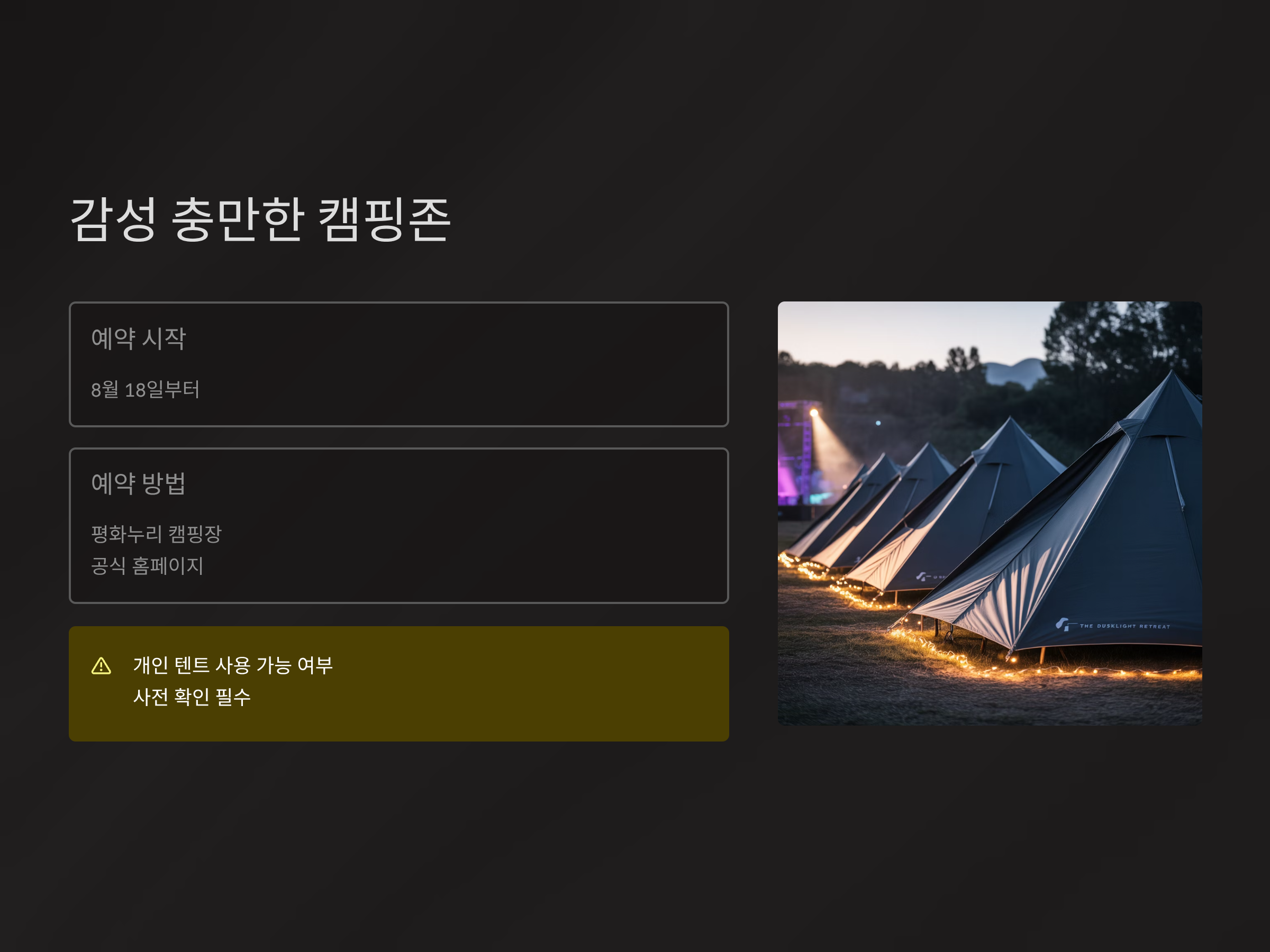 단, 개인 텐트 사용이 가능한지 여부는 사전에 꼭 확인하셔야 해요.