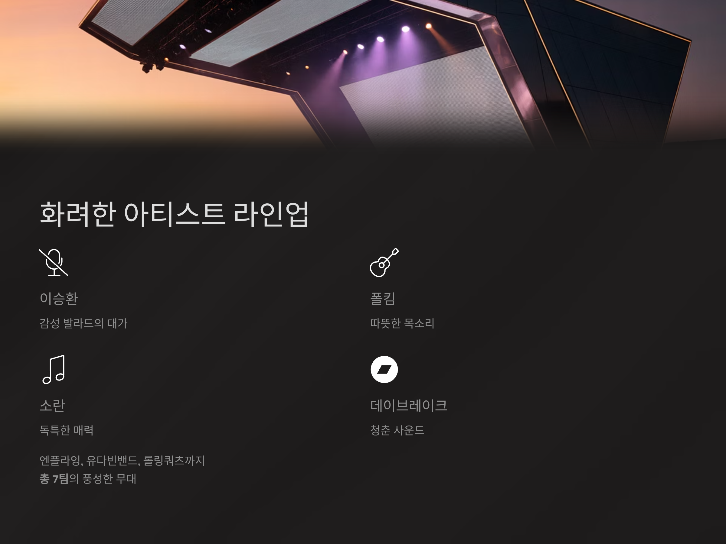 이승환, 폴킴, 데이브레이크, 엔플라잉, 소란, 유다빈밴드, 롤링쿼츠까지 총 7팀의 라인업은 공연만으로도 충분히 매력적이죠.